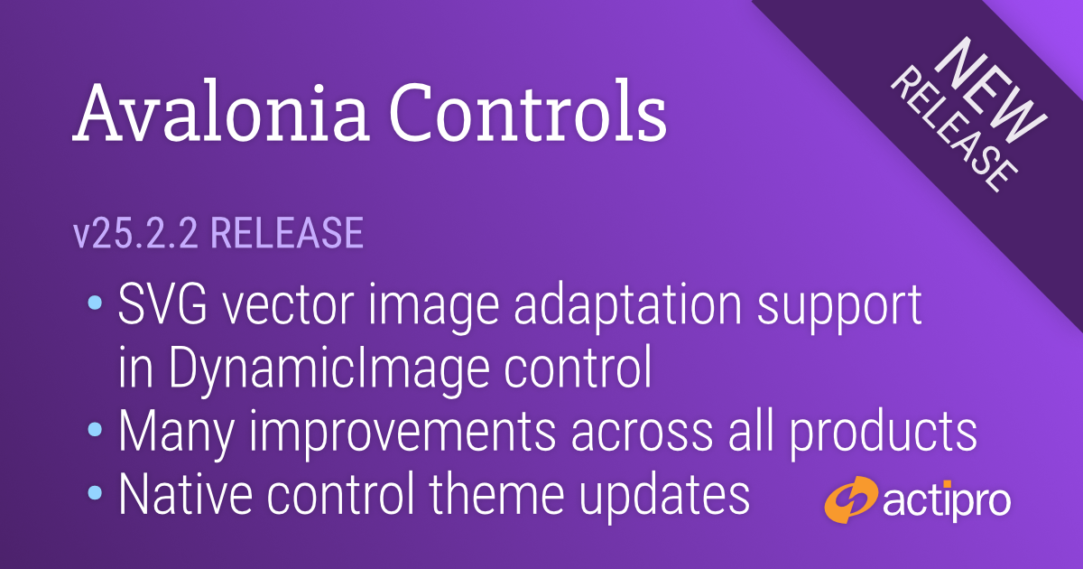 A new Avalonia Controls release is now available. This new version makes improvements across the entire product line. One particularly nice new feature is the ability to now use SVG images with our ImageProvider infrastructure and DynamicImage control.